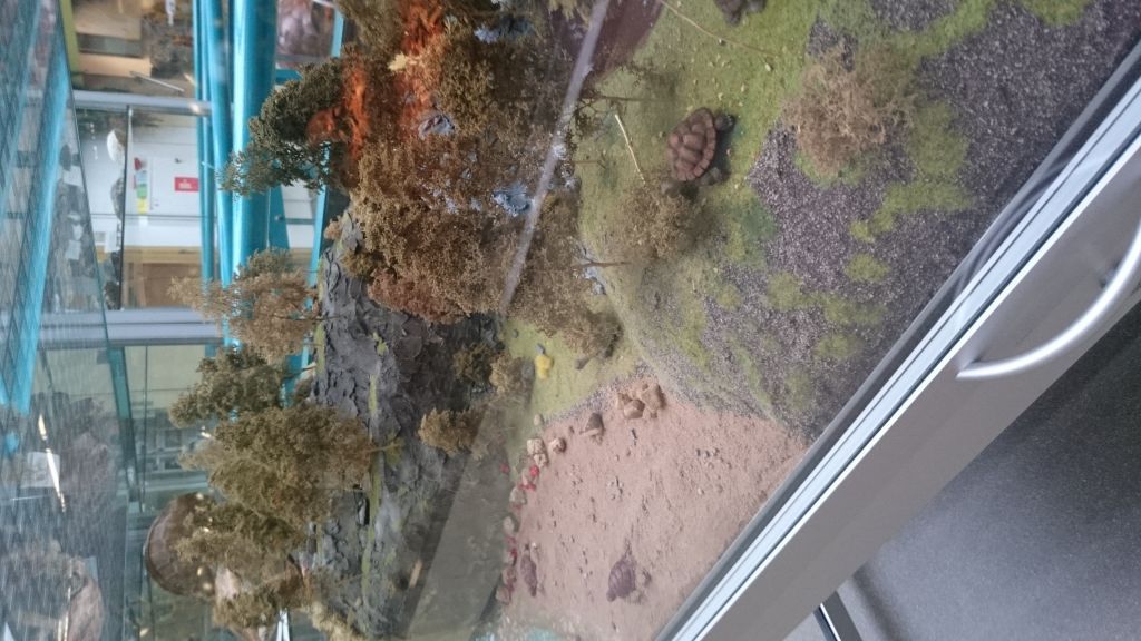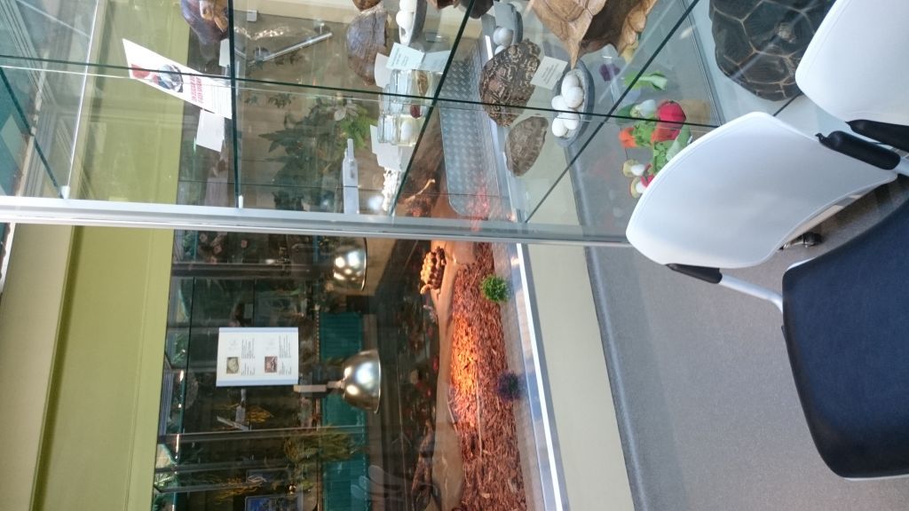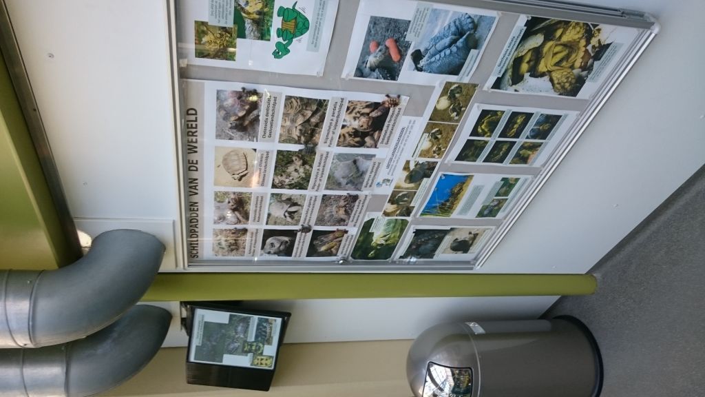 Schildpadden behoren tot de oudste dieren op aarde. Op de 1e verdieping van het Schildpaddencentrum was een tentoonstelling ingericht. Met deze tentoonstelling werd het educatieve aspect van het centrum ingevuld. In vitrines waren opgezette soorten schildpadden te zien, maar ook voorwerpen die door de douane onder terugkerende vakantiegangers in beslag waren genomen. Het betrof hier veelal voorwerpen die van bedreigde soorten schildpadden waren gemaakt. Voorbeelden waren een haarkam, een banjo en een kaarsenstandaard. Na het bekijken van de collectie levende schildpadden en tentoonstelling konden kinderen een leerzame speurtocht doen.